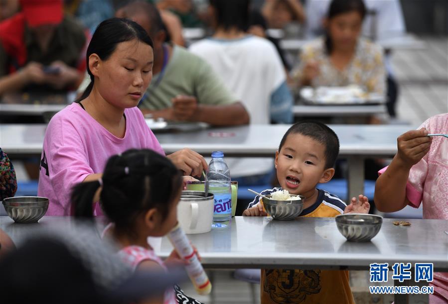 7月14日,小朋友在宿松縣洲頭鄉(xiāng)中心小學集中安置點吃晚餐。近日,安徽省宿松縣洲頭鄉(xiāng)泗洲村的300多名村民因洪水被轉(zhuǎn)移到該鄉(xiāng)中心小學集中安置點。安置點工作人員、志愿者利用學校食堂為村民們烹飪飯菜,讓村民們在安置點吃上熱騰騰的三餐。新華社記者 劉軍喜 攝