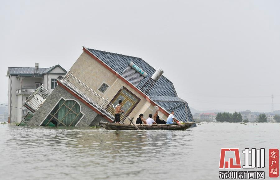 2020年7月15日,江西省鄱陽縣油墩街鎮(zhèn)同興村,村莊受到洪水圍困,大部分村民已經(jīng)被轉(zhuǎn)移出去,仍有少數(shù)村民選擇留守家中積極自救繼續(xù)生活。7月8日晚,鄱陽縣油墩街鎮(zhèn)西江因特大暴雨出現(xiàn)漫堤決口,5個(gè)行政村被洪水圍困,數(shù)萬名群眾被及時(shí)疏散轉(zhuǎn)移。同興村村民張瑤康回憶起了當(dāng)時(shí)的場景,“水一下子就涌進(jìn)來,等緩過神來趕緊向二樓轉(zhuǎn)移一樓的物品。洪水來時(shí)只從一樓搶到了一些輕便易拿的東西,冰箱、洗衣機(jī)之類的大物件,至今仍浸泡在一樓水中?!?5日,記者跟隨張瑤康乘船回家,抵達(dá)后看到,一樓淹沒在水中,一個(gè)綁在二樓護(hù)欄的木梯成為進(jìn)出“家門”的唯一通道。“每天劃船去村里運(yùn)送水和食物,家里有煤氣罐和灶臺。因?yàn)?0多歲的老母親行動(dòng)不便,我們選擇留守家中?!薄半m然對岸就有安置點(diǎn),但還是更愿待在自己家里,一來是不愿意給政府添麻煩,二來能每天看著自己的房子心里踏實(shí)?!蓖d村村民張長來夫婦帶著剛剛領(lǐng)到的大米、方便面、飲用水乘船回到家中。記者在現(xiàn)場看到,隨著各方救援力量和物資的匯聚,被洪水圍困的村民生活雖有不便,但生活仍在繼續(xù)。“房子不倒,家就在,我們要積極面對,早日重建家園。”張瑤康告訴記者。