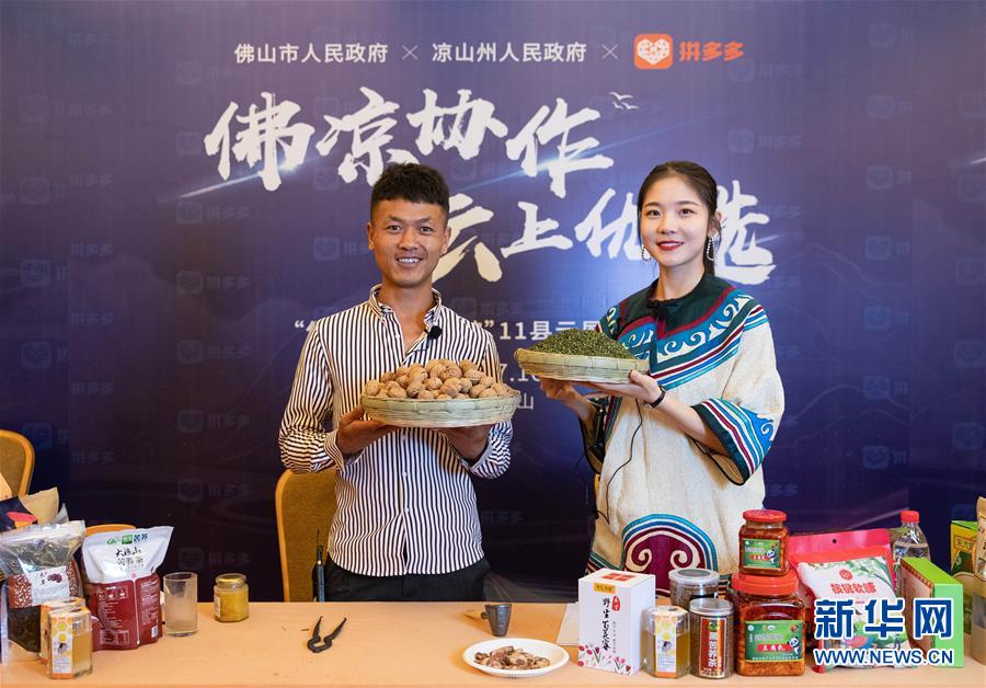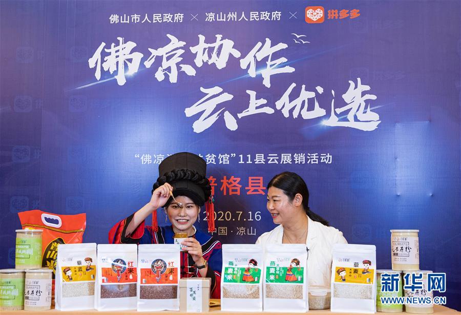 7月18日,在涼山州昭覺縣粵川東西部扶貧協(xié)作項目產(chǎn)業(yè)園,昭覺縣縣長赫紹洪(右)在直播活動中向網(wǎng)友推薦農(nóng)特產(chǎn)品。新華社記者江宏景攝
