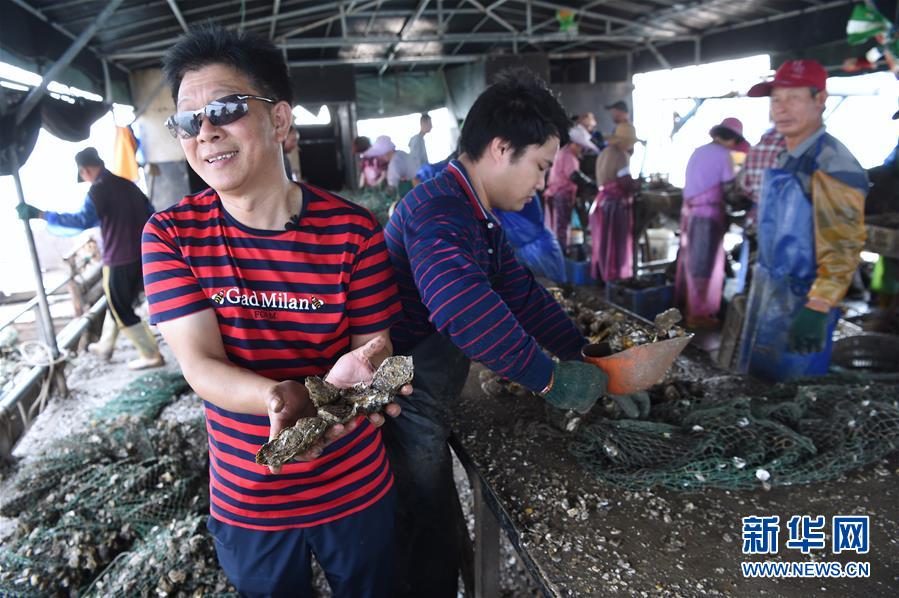 7月16日,福建省霞浦縣長春鎮(zhèn)秋竹崗村養(yǎng)殖大戶俞開明(前左)在海上分揀平臺展示剛出水的三倍體生蠔。新華社記者姜克紅攝