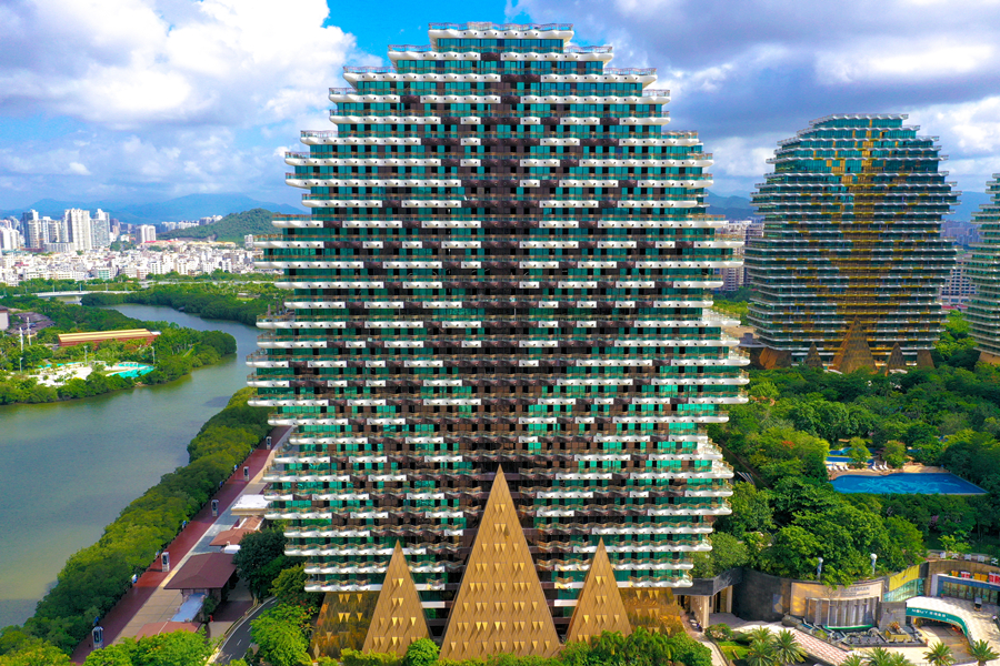 2020年7月20日,海南省三亞市,圖為航拍的“九棵大樹”建筑群,其具象性的建筑設(shè)計(jì)風(fēng)格,既有建筑之美,又見(jiàn)自然靈韻。