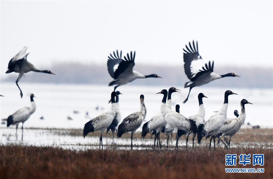 在草海國家級自然保護(hù)區(qū)越冬的黑頸鶴(2019年12月11日攝)。新華社記者楊文斌攝
