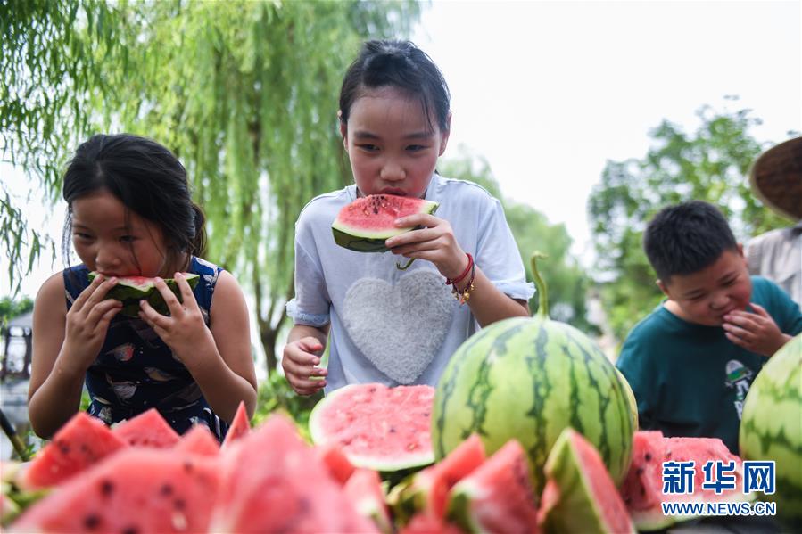 7月22日,廟兜村的孩子們?cè)诒荣惓晕鞴?。?dāng)日是大暑節(jié)氣,浙江省湖州市吳興區(qū)織里鎮(zhèn)廟兜村舉行了趣味“賽西瓜”比賽,迎接這個(gè)“火熱”的節(jié)氣。廟兜村種植有500多畝西瓜,目前正值西瓜豐收的時(shí)節(jié),村民們用“賽西瓜”的形式,感受豐收的喜悅。新華社記者徐昱攝