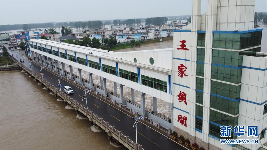 這是7月22日在安徽省阜南縣拍攝的淮河王家壩閘(無人機照片)。7月22日14時,淮河王家壩水位降至28.73米,超警戒水位1.23米,低于保證水位0.57米。新華社記者張端攝