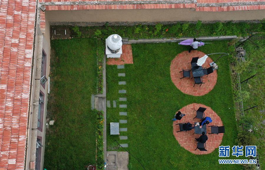 7月5日拍攝的阿壩縣查理鄉(xiāng)神座村客棧院落(無人機(jī)照片)。新華社記者陳天湖攝