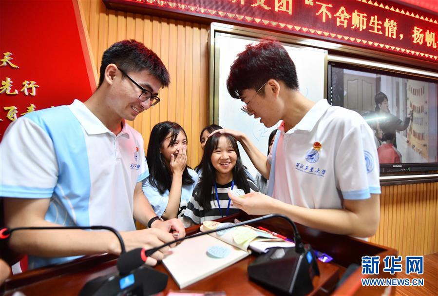 在融水苗族自治縣思源實(shí)驗(yàn)學(xué)校舉辦的支教團(tuán)送別晚會(huì)上,支教老師譚博天(右一)和徐晨曦(左一)收到同學(xué)們的寄語卡片(7月22日攝)。