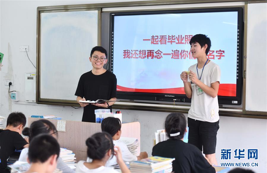 在融水苗族自治縣民族中學(xué)1818班舉辦的送別班會(huì)上,支教老師高潔給同學(xué)們上最后一節(jié)英語課(7月23日攝)。新華社記者黃孝邦攝