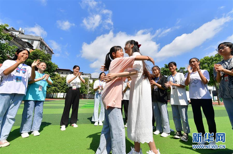 在融水苗族自治縣民族中學(xué)1818班舉辦的送別班會(huì)上,同學(xué)們和支教老師高潔(左一)擁抱告別(7月23日攝)。新華社記者黃孝邦攝