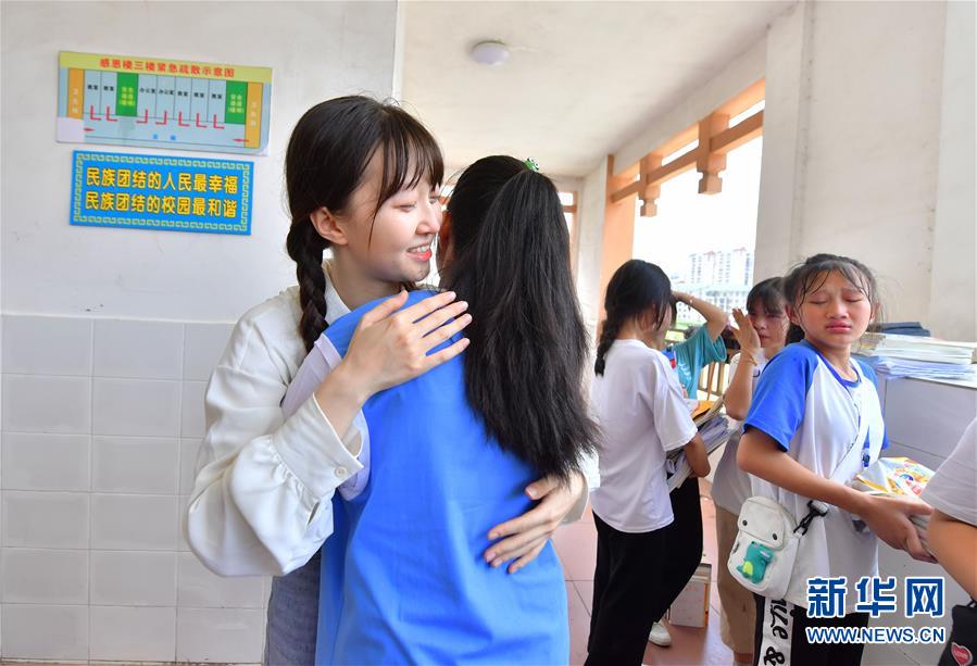 在融水苗族自治縣民族中學(xué)1818班舉辦的送別班會上,同學(xué)們和支教老師高潔(左一)擁抱告別(7月23日攝)。新華社記者黃孝邦攝