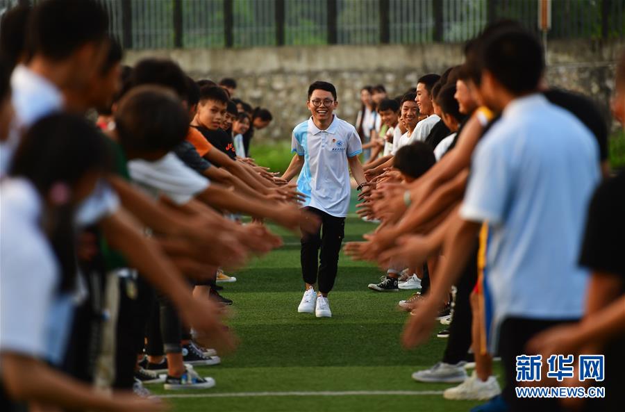 在融水苗族自治縣思源實(shí)驗(yàn)學(xué)校舉辦的支教團(tuán)送別晚會(huì)上,支教老師溫昌浩(中)接受同學(xué)們的祝福(7月22日攝)。新華社記者黃孝邦攝
