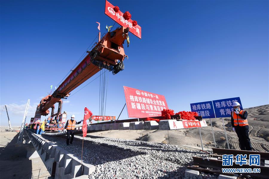 中鐵一局的施工人員在格庫鐵路新疆段固定最后一組軌排(7月21攝)。新華社記者 丁磊 攝