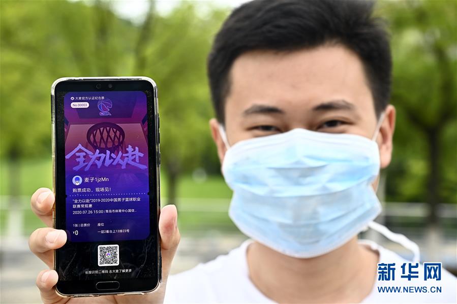 7月26日,在青島國(guó)信體育館,蘇柯帆展示自己的CBA電子票。他成為CBA聯(lián)賽復(fù)賽允許觀眾現(xiàn)場(chǎng)觀賽后,首位進(jìn)場(chǎng)的觀眾。當(dāng)日,在山東青島舉行的2019-2020賽季中國(guó)男子籃球職業(yè)聯(lián)賽(CBA)復(fù)賽第二階段(嶗山賽區(qū))比賽中,醫(yī)護(hù)人員、教師、公安戰(zhàn)線人士通過(guò)官方購(gòu)票平臺(tái),完成包括核酸檢測(cè)在內(nèi)的相關(guān)流程后進(jìn)場(chǎng)觀看了上海久事隊(duì)迎戰(zhàn)山東西王隊(duì)的比賽。觀賽期間,觀賽者須全程佩戴口罩,對(duì)號(hào)入座,嚴(yán)格保持間隔一米就座。退場(chǎng)時(shí),觀眾須按照自后向前、先兩邊后中間的順序,保持“一米線”社交距離有序退場(chǎng)。新華社記者 郭緒雷 攝