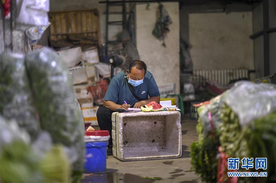 7月26日,在烏魯木齊新聯(lián)農(nóng)副產(chǎn)品綜合市場內(nèi),商販在計算一天的收入。新華社記者 趙戈 攝