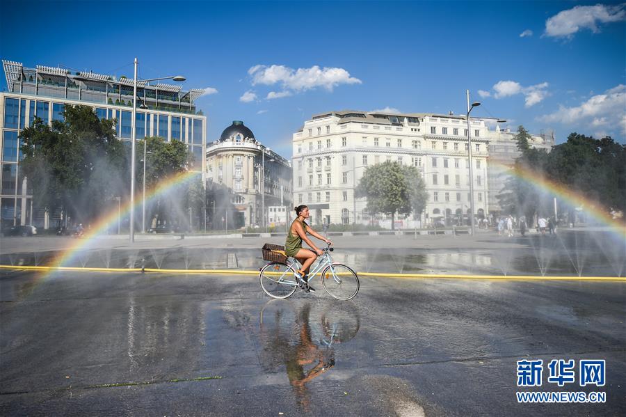 7月28日,在奧地利維也納,一名女子騎車(chē)經(jīng)過(guò)一處廣場(chǎng)的噴水設(shè)施。新華社記者郭晨攝