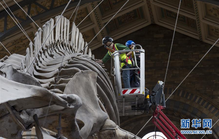 7月27日,工作人員在英國倫敦的自然歷史博物館大廳內(nèi)清潔一具藍鯨骨架。受新冠疫情影響關(guān)閉數(shù)月的英國自然歷史博物館將于8月5日重新對外開放,目前館方正在為重新開放做最后準備。參觀者需要提前預(yù)約參觀時段、全程佩戴口罩且保持安全距離。新華社記者韓巖攝