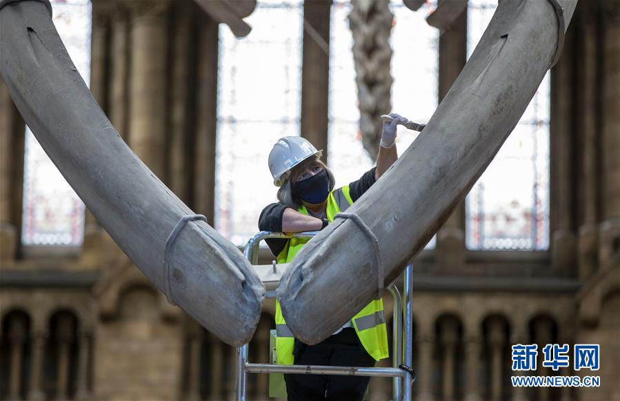 7月27日,工作人員在英國倫敦的自然歷史博物館大廳內(nèi)清潔一具藍(lán)鯨骨架。受新冠疫情影響關(guān)閉數(shù)月的英國自然歷史博物館將于8月5日重新對外開放,目前館方正在為重新開放做最后準(zhǔn)備。參觀者需要提前預(yù)約參觀時段、全程佩戴口罩且保持安全距離。新華社記者韓巖攝