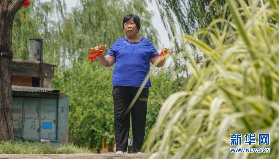 草廠四條居民丁淑鳳在北京市東城區(qū)三里河練習(xí)打快板(6月8日攝)。新華社記者馬曉冬攝