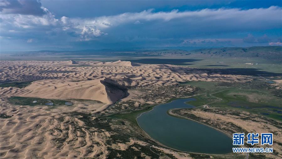 這是7月28日拍攝的青海湖沙島一隅(無人機照片)。盛夏傍晚,位于青海湖東北部的沙島,島內湖泊星羅棋布,沙丘連綿起伏,風景別致。金沙與湖水掩映,在陽光的勾勒下形成一幅美麗的畫卷。新華社記者吳剛攝