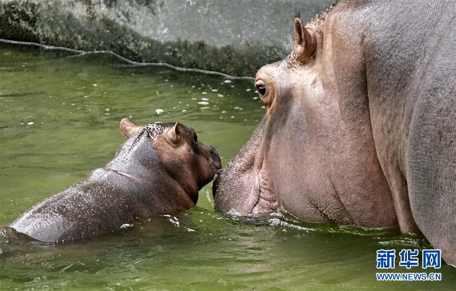 北京動(dòng)物園的河馬母子在恒溫水池內(nèi)乘涼(7月30日攝)。炎炎夏日,北京動(dòng)物園根據(jù)動(dòng)物生活習(xí)性,為動(dòng)物配備了自動(dòng)噴淋噴霧、空調(diào)籠舍、恒溫水池、遮陽(yáng)棚等各類避暑設(shè)施,同時(shí)還準(zhǔn)備了西瓜等降溫食品,保障動(dòng)物平安舒適地度過(guò)伏天。新華社記者李欣攝