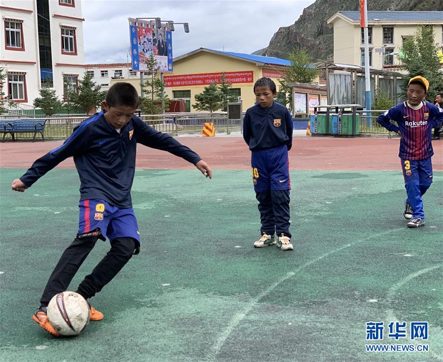 拉孜鄉(xiāng)中心小學(xué)足球興趣小組的學(xué)生在進(jìn)行足球訓(xùn)練(7月29日攝)。新華社記者洛卓嘉措攝