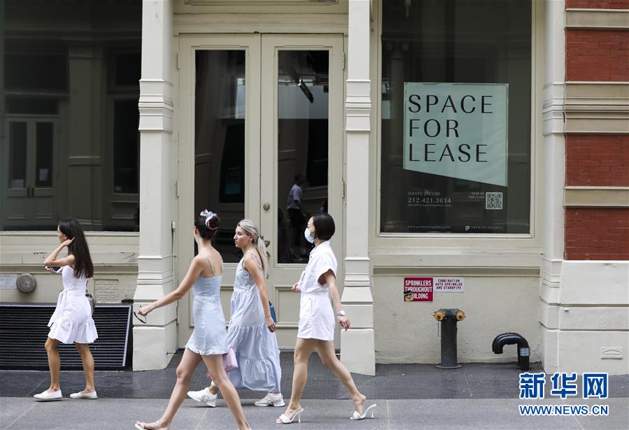 7月30日,在美國(guó)紐約蘇豪商業(yè)區(qū),人們從一家招租的店面旁走過。美國(guó)商務(wù)部30日公布的首次預(yù)估數(shù)據(jù)顯示,受新冠疫情導(dǎo)致經(jīng)濟(jì)大面積“停擺”和消費(fèi)停滯拖累,今年第二季度美國(guó)實(shí)際國(guó)內(nèi)生產(chǎn)總值(GDP)按年率計(jì)算下滑32.9%,創(chuàng)1947年有記錄以來最大降幅。新華社記者王迎攝
