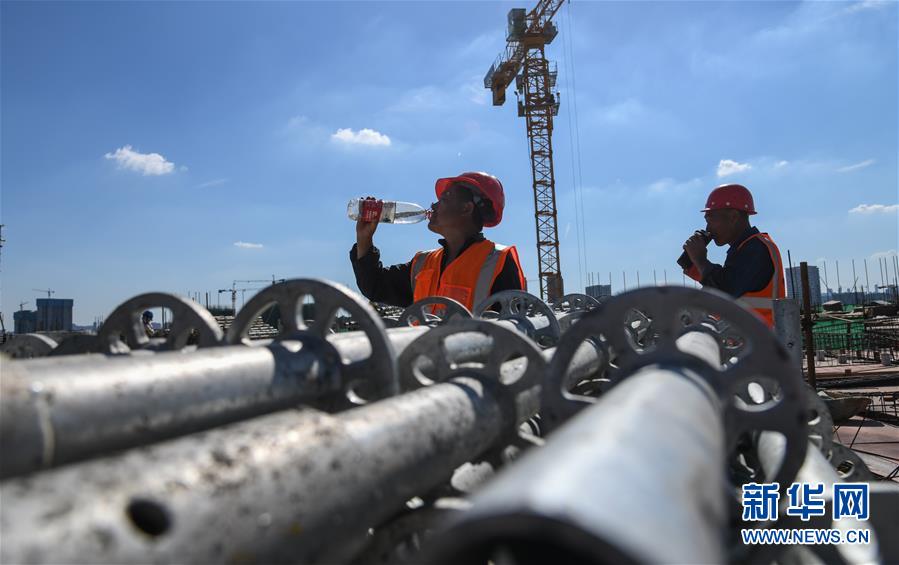 8月3日,工人在長江文創(chuàng)產(chǎn)業(yè)園項(xiàng)目工地休息喝水。進(jìn)入8月,武漢迎來持續(xù)高溫天氣。在湖北廣電傳媒基地工程的工地上,中建三局總承包公司1500多名工人持續(xù)奮戰(zhàn),力保工程進(jìn)度。該工程是我國中部地區(qū)首個國家級廣播影視媒體基地,由湖北廣電傳媒大廈項(xiàng)目、長江文創(chuàng)產(chǎn)業(yè)園項(xiàng)目、廣電生活配套項(xiàng)目三大板塊組成,總建設(shè)規(guī)模130萬平方米。自今年3月25日獲批正式復(fù)工以來,承建方克服困難,把因疫情影響耽誤的工期趕了回來,預(yù)計(jì)將按原計(jì)劃完成建設(shè)任務(wù)。新華社記者程敏攝