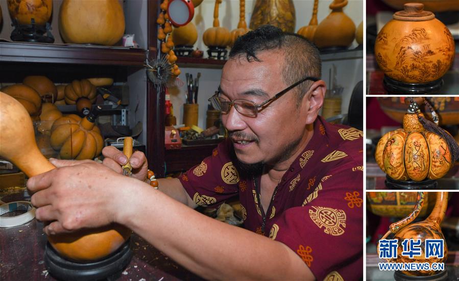 這是一張拼版照片。左:8月5日,侯景偉在葫蘆上進(jìn)行創(chuàng)作。右:侯景偉創(chuàng)作的葫蘆工藝品(8月5日攝)。今年55歲的吉林四平人侯景偉自幼與家人學(xué)習(xí)雕刻、烙畫藝術(shù)。經(jīng)過(guò)多年潛心研究,他將浮雕和烙畫工藝相結(jié)合,通過(guò)拋光、起稿、雕刻、烙燙、套色等十余道工藝,制作展現(xiàn)傳統(tǒng)文化、民俗故事的葫蘆工藝品。2020年,侯景偉被評(píng)為四平市非物質(zhì)文化遺產(chǎn)項(xiàng)目侯氏葫蘆雕刻烙畫代表性傳承人。他說(shuō):“希望有更多人加入到非遺傳承隊(duì)伍中,讓小葫蘆‘講’出更多民俗故事?!毙氯A社記者張楠攝