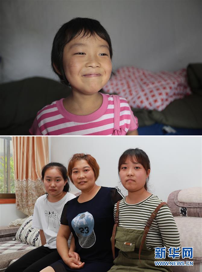 拼版照片:上圖為2010年8月20日,盼望開學(xué)的小雪梅在受災(zāi)群眾安置點(diǎn)的帳篷內(nèi)(新華社記者任正來攝);下圖為2020年7月14日,雪梅(右)和母親、妹妹在一起(新華社記者杜哲宇攝)。新華社發(fā)