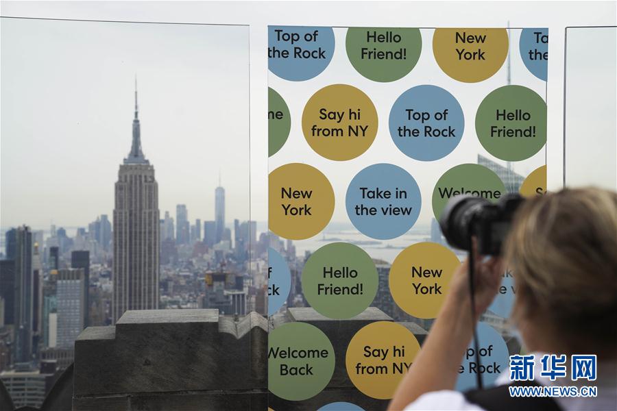 8月6日,在美國紐約,一名攝影師在洛克菲勒中心觀景臺上拍攝城市景觀。當(dāng)日,3月份暫時關(guān)閉的洛克菲勒中心觀景臺恢復(fù)對公眾開放。每天13時至21時,人們可戴口罩前往參觀。新華社記者王迎攝