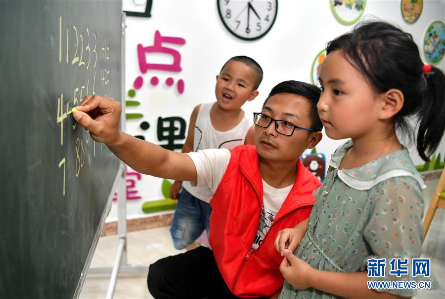 陜西安康市嵐皋縣城關(guān)鎮(zhèn)城北易地扶貧搬遷安置小區(qū)“四點(diǎn)半課堂”的老師在輔導(dǎo)孩子們學(xué)習(xí)數(shù)字(7月29日攝)。地處秦巴山區(qū)的嵐皋縣山多溝深,群眾居住分散,長(zhǎng)期以來(lái)易地搬遷成為這里脫貧攻堅(jiān)的重點(diǎn)。為避免易地搬遷群眾就業(yè)不充分、辦事不方便、管理不到位等問題,嵐皋縣依托市場(chǎng)完善社區(qū)生活、醫(yī)療、教育、娛樂等服務(wù)設(shè)施,并開展技能培訓(xùn)、開辦社區(qū)工廠,讓搬遷居民“穩(wěn)得住”“能致富”。新華社記者劉瀟攝。