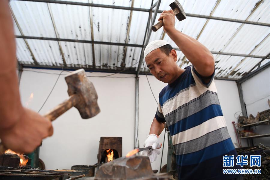 8月10日,甘肅省臨夏回族自治州積石山縣大河家鎮(zhèn)的村民馬維正在制作保安腰刀。新華社記者陳斌攝。
