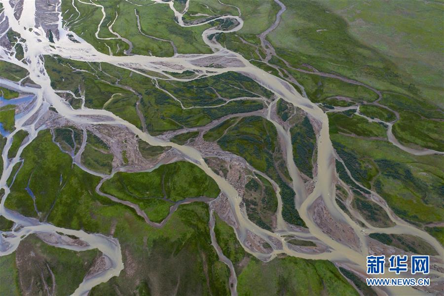 俯瞰泥拉壩濕地里發(fā)辮般的河流,該濕地泥炭富集、水系發(fā)達(8月9日攝,無人機照片)。新華社記者江宏景攝。