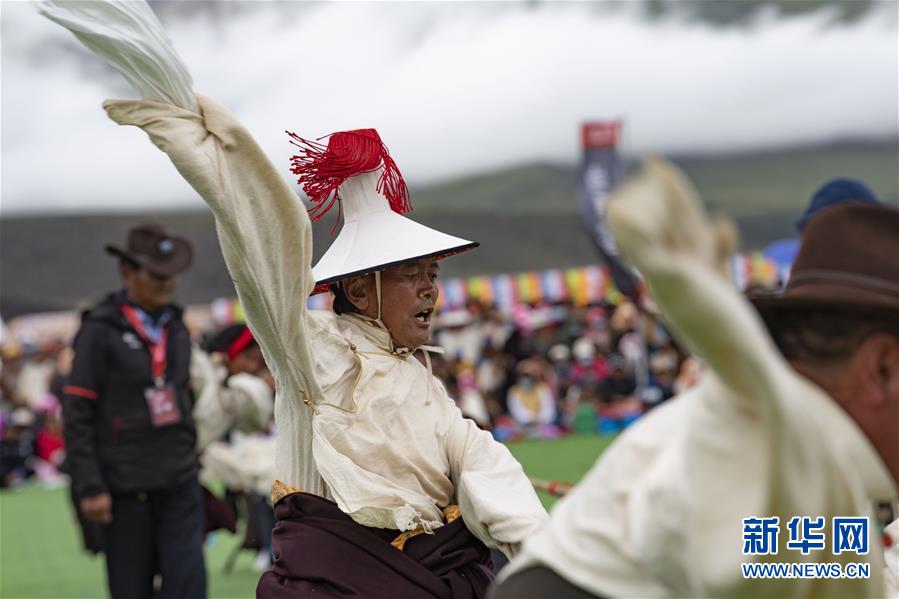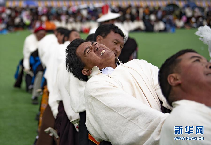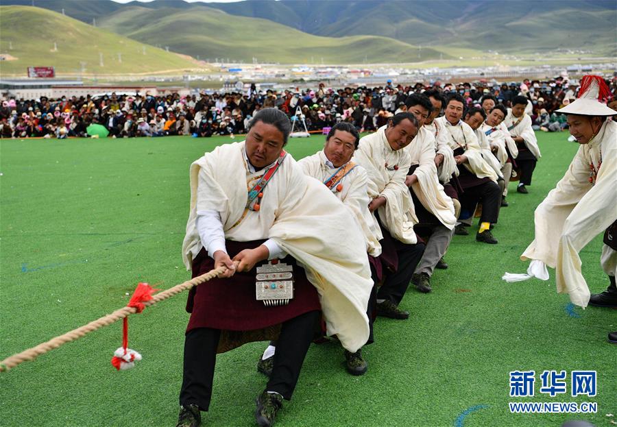 8月10日,當(dāng)雄縣牧民在拔河比賽中。新華社記者普布扎西攝。