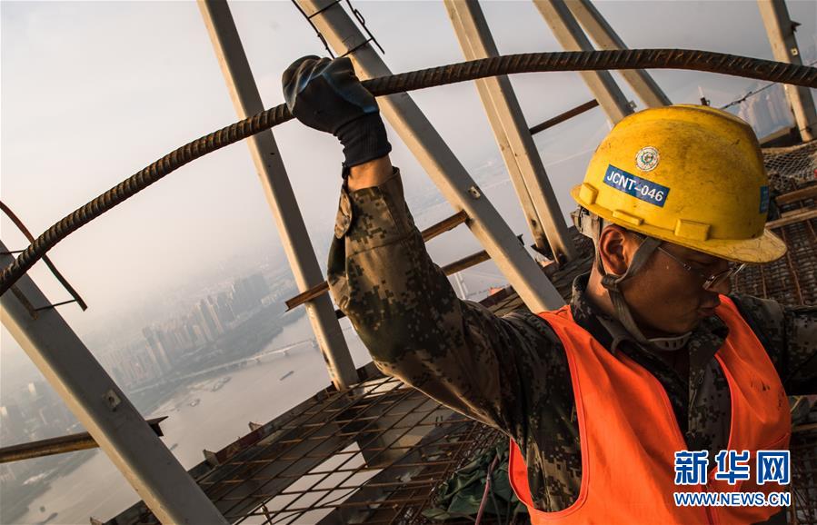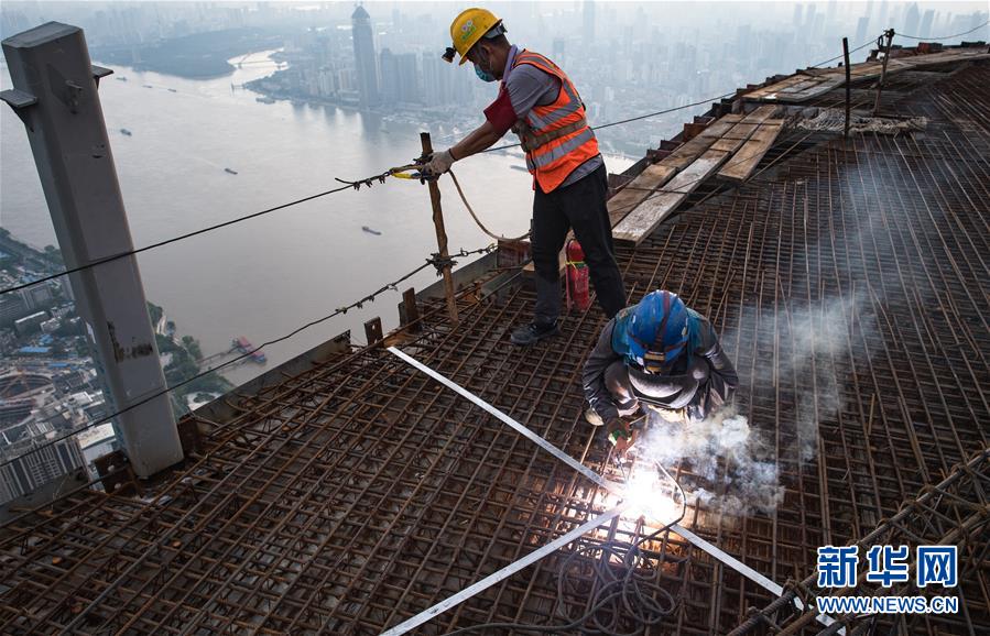 8月11日,工人在武漢綠地中心項(xiàng)目建設(shè)現(xiàn)場(chǎng)近500米的高空施工。新華社記者肖藝九攝
