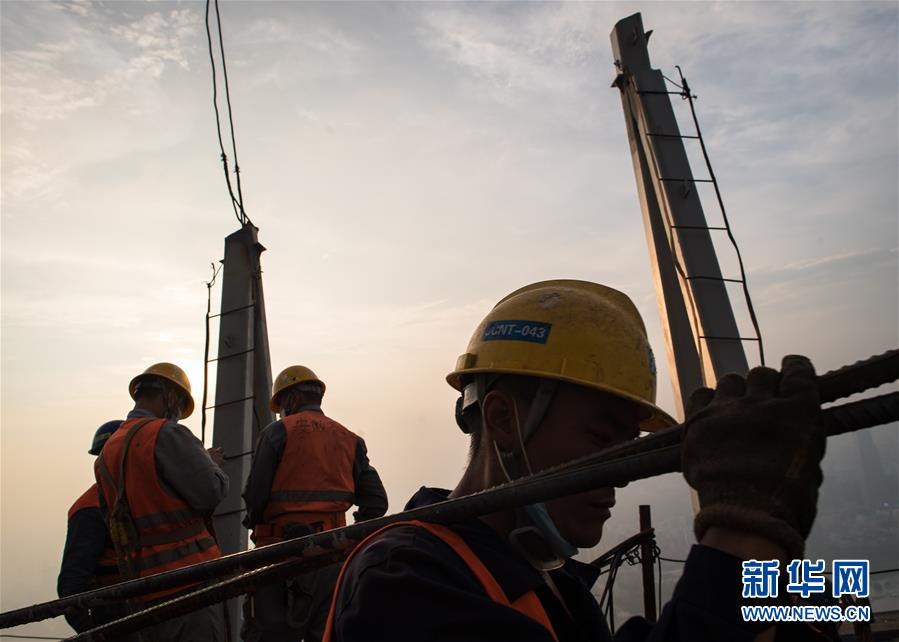 8月11日傍晚,工人在武漢綠地中心項(xiàng)目建設(shè)現(xiàn)場(chǎng)近500米的高空施工。新華社記者肖藝九攝