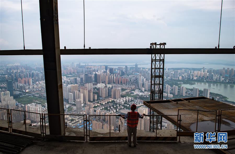 8月11日,一名工人在武漢綠地中心項(xiàng)目建設(shè)現(xiàn)場近500米的高空遠(yuǎn)眺。新華社記者肖藝九攝