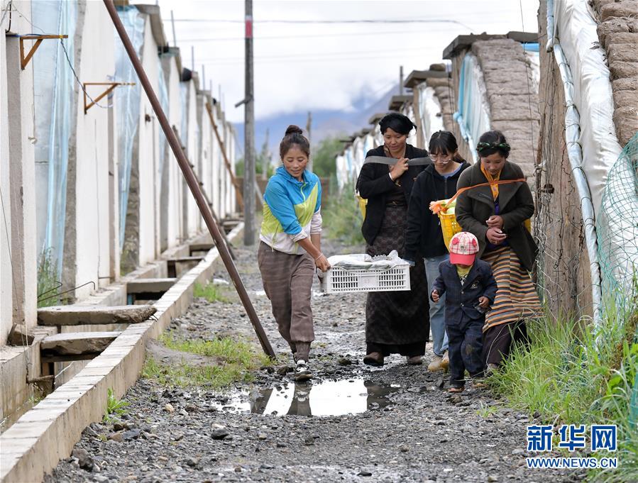 格桑旺姆(左三)和姐姐德吉卓瑪(左一)帶領(lǐng)雇傭的殘障村民巴珍(右一)搬運大棚出產(chǎn)的新鮮蔬菜(8月3日攝)。新華社記者 李賀 攝