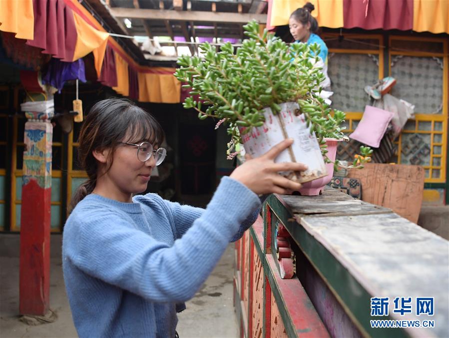 格桑旺姆用花草裝飾自己家(8月3日攝)。新華社記者 李賀 攝
