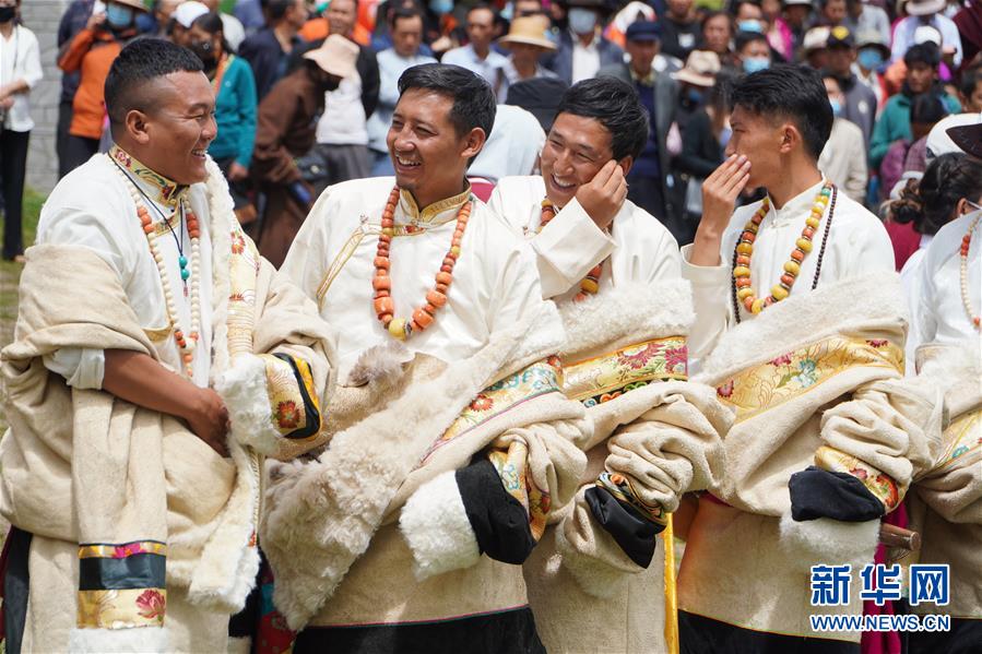 8月12日,演員在開幕式上表演舞蹈。當(dāng)日,2020中國碌曲鍋莊舞展演暨甘南藏族自治州第六屆少數(shù)民族傳統(tǒng)體育運(yùn)動會在甘肅省甘南州碌曲縣夏澤灘草原上舉行。開幕式上,三千余名身著節(jié)日盛裝的演員和當(dāng)?shù)厝罕娫诓菰掀鹞?,雨后初晴的草原上充滿歡聲笑語。新華社記者 耿馨寧 攝