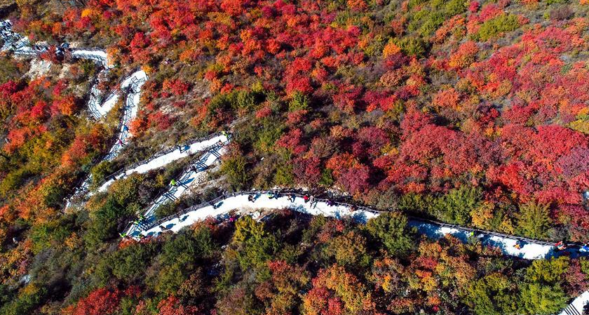 金秋十月,河北省涉縣偏城鎮(zhèn)太行紅葉大峽谷的紅葉進入觀賞佳期,吸引眾多游客前來登山賞景。