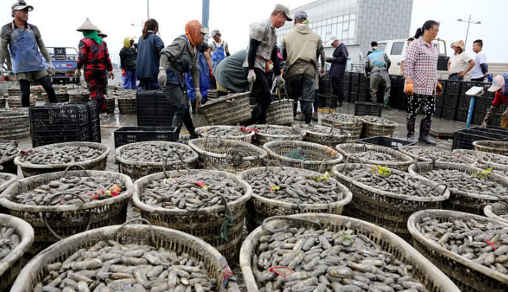 2019年7月9日,漁民們?cè)诮K連云港沿海地區(qū)海邊的灘涂上將剛收獲的海蟶運(yùn)送上岸裝箱外運(yùn)。