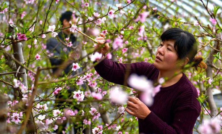 隨著氣溫升高,河北省邯鄲市邯山區(qū)碩果春農(nóng)業(yè)園大棚內的桃花競相綻放。