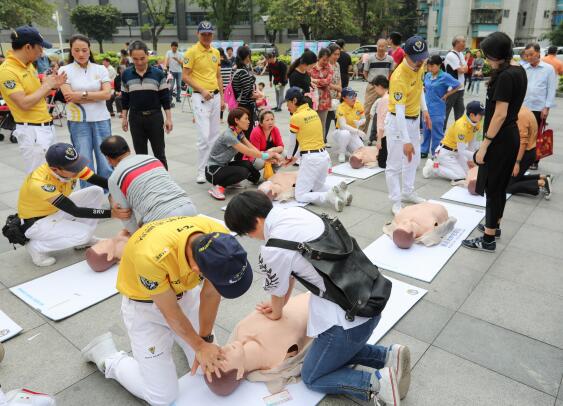 深圳市賽場救護隊的專業(yè)人員在現場為蓮花一村的社區(qū)居民普及了大眾急救技能,并指導大家進行模擬心肺復蘇的演練,中老年朋友則享受了免費的體質檢測服務。
