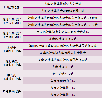 深圳市2018年第二屆社會(huì)體育指導(dǎo)員技能交流展示大賽各單項(xiàng)比賽一等獎(jiǎng)獲獎(jiǎng)名單