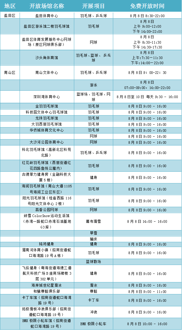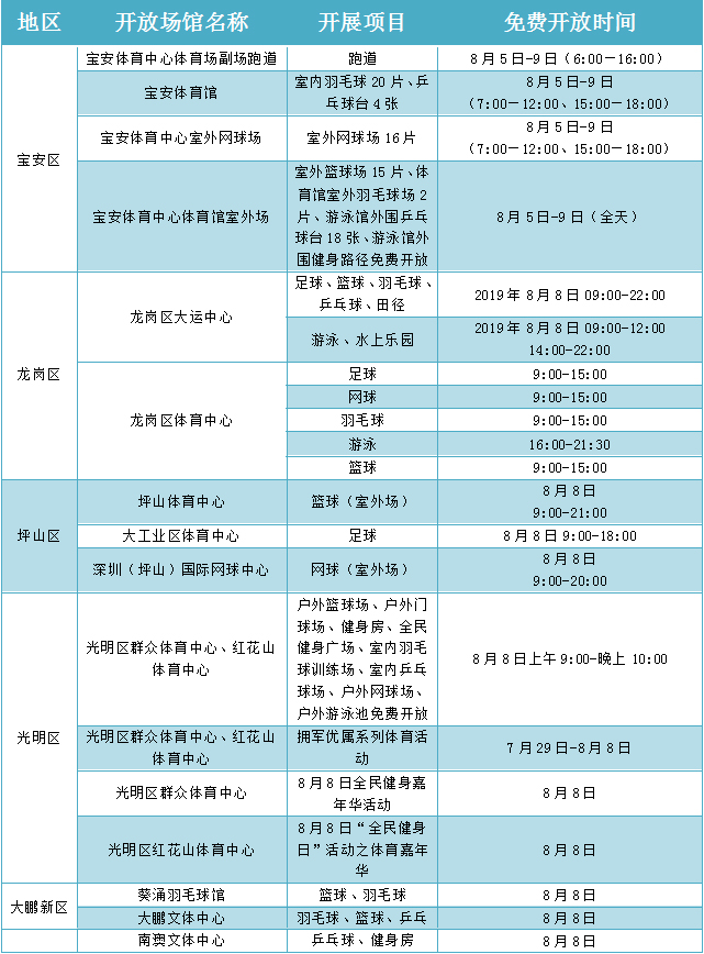在“全民健身日”期間,深圳舉辦“全民健身嘉年華”及各類市級健身賽事活動16場,各區(qū)、各相關(guān)單位也結(jié)合實際,組織推出80余場全民健身運動,如面向全市市民的大型國民體質(zhì)監(jiān)測和健身咨詢活動、全民健身大講堂活動等。各級社會體育指導員也將開展義務(wù)健身輔導,利用豐富的體育專業(yè)技能,向廣大群眾講解健身知識,推廣健身方法,普及科學健身理念,為全民健身活動提供技術(shù)指導服務(wù)。8月8日“全民健身日”當天,深圳市體育中心以及各區(qū)體育場館,也將免費向市民或單位開放。