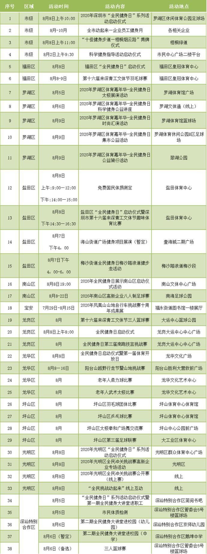 在啟動(dòng)當(dāng)日,全市各區(qū)也同步聯(lián)動(dòng),啟動(dòng)了“全民健身日”系列活動(dòng)。即日起至8月10日,深圳將陸續(xù)推出近40項(xiàng)全民健身運(yùn)動(dòng)系列活動(dòng),內(nèi)容涵蓋來深青工文體節(jié)、企業(yè)員工健身月、體育嘉年華系列展演、全民沖關(guān)線上挑戰(zhàn)賽、足球、籃球、老年太極、柔力球、國民體質(zhì)測定、全民健身大講堂、健身步道健步行等。此外,全市各公益體育館也將面向市民免費(fèi)開放,大家可關(guān)注各場館進(jìn)行預(yù)約。