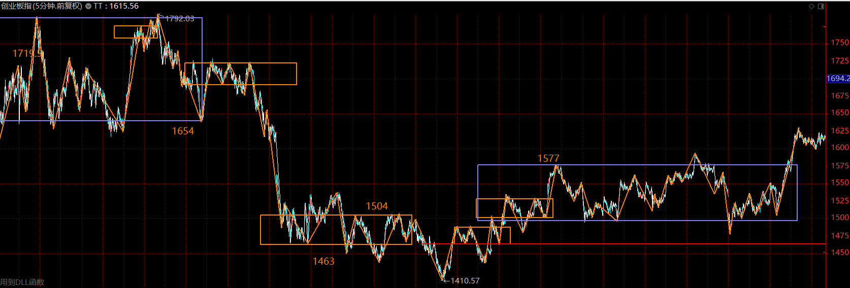 創(chuàng)業(yè)板這里在構(gòu)建30分鐘級別的三買,周一如果不跌破1577點,這里將是創(chuàng)業(yè)板主升行情的起點。如若重新跌回中樞內(nèi)部,則按中樞震蕩處理。創(chuàng)業(yè)板走勢要強(qiáng)于主板很多,后續(xù)行情多半仍然圍繞創(chuàng)業(yè)板展開。