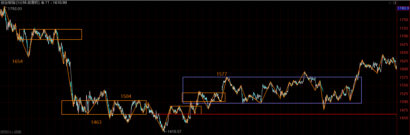 創(chuàng)業(yè)板指數(shù)依舊強(qiáng)勢,這里在構(gòu)建30分鐘級(jí)別的三買,以1577點(diǎn)為界,如果回調(diào)不破,則這里將是創(chuàng)業(yè)板主升行情的起點(diǎn)。如若重新跌回中樞內(nèi)部,則按中樞震蕩處理。創(chuàng)業(yè)板走勢要強(qiáng)于主板很多,后續(xù)行情多半仍然圍繞創(chuàng)業(yè)板展開。