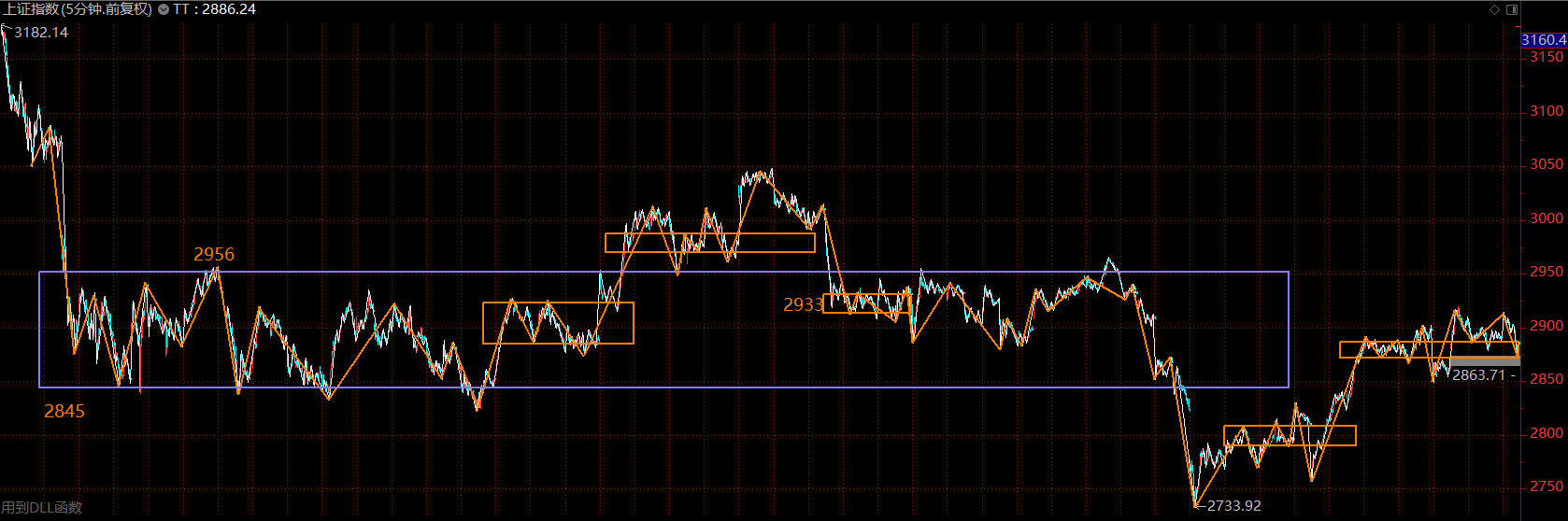 上證指數(shù)上周在這個(gè)位置做中樞擴(kuò)展,將五分鐘上漲的第二個(gè)中樞擴(kuò)展為三十分鐘級(jí)別的。這是強(qiáng)勢的一種表現(xiàn),市場在震蕩中消化拋壓。這里需關(guān)注大中樞的下軌2845點(diǎn),跌破后,可能會(huì)帶來指數(shù)的二次探底,這將是絕佳的加倉點(diǎn)位,不跌破則市場隨時(shí)會(huì)上攻2950點(diǎn)。目前態(tài)勢下,應(yīng)以持倉為主。