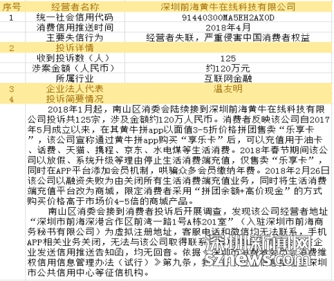 2018年1月起,南山區(qū)消委會(huì)陸續(xù)接到深圳前海黃牛在線科技有限公司投訴共125宗,涉及金額約120萬(wàn)人民幣。消費(fèi)者反映該公司自2017年5月成立以來(lái),在其黃牛拼app以面值3-5折價(jià)格拼團(tuán)售賣“樂(lè)享卡”,該公司宣稱通過(guò)黃牛拼app購(gòu)買“享樂(lè)卡”后,可以用該卡充值油卡、話費(fèi)、天貓、攜程、京東、水電煤等生活消費(fèi)。最初消費(fèi)者購(gòu)買的“樂(lè)享卡”可正常用于生活消費(fèi)端充值,直至2018年春節(jié)期間該公司以放假、系統(tǒng)升級(jí)等理由停止生活消費(fèi)端充值,僅售賣“樂(lè)享卡”,同時(shí)在APP平臺(tái)添加會(huì)員機(jī)制,哄騙眾多會(huì)員繳納年費(fèi)。2018年2月26日該公司以融資失敗為由關(guān)閉所有生活消費(fèi)端充值業(yè)務(wù),同時(shí)將生活消費(fèi)端充值平臺(tái)改為商城,限定消費(fèi)者采用“拼團(tuán)余額+高價(jià)現(xiàn)金”的方式購(gòu)買價(jià)格高于市場(chǎng)價(jià)4-5倍的商城產(chǎn)品。